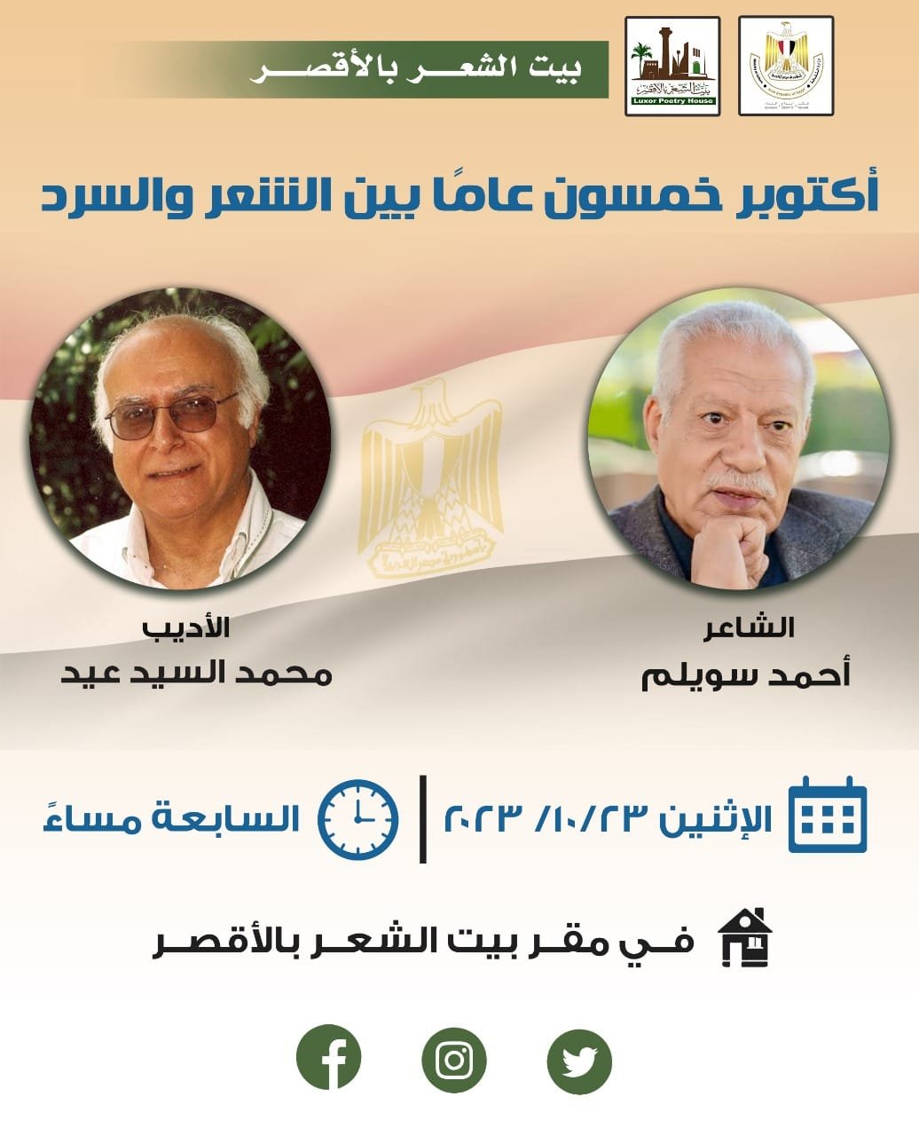 أصدقاء و صديقات بيت الشعر بالأقصر معكم و بكم نفتح أبواب الجمال و الإبداع نلتقي معكم السابعة مساء الإثنين الموافق ٢٣ من أكتوبر، في أمسية غير مسبوقة في جمالها و فرادتها ( أكتوبر خمسون عامًا من الشعر والسرد)
