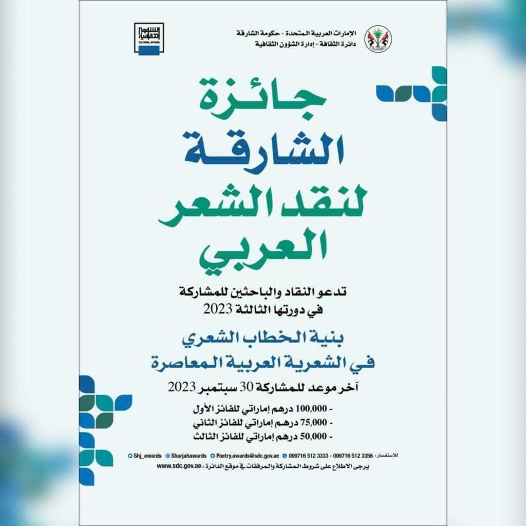 الاثنين المقبل ندوة للتعريف بجائزة الشارقة لنقد الشعر العربي الدورة الثالثة