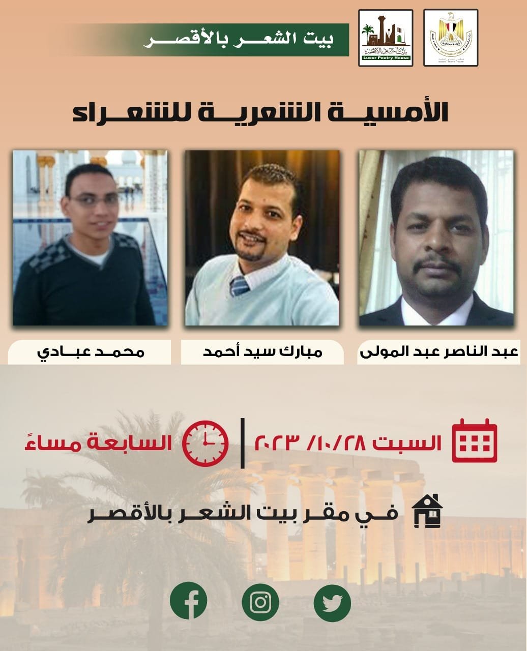 أصدقاء و صديقات بيت الشعر بالأقصر معكم و بكم نفتح أبواب الجمال و الإبداع نلتقي معكم السابعة مساء السبت الموافق ٢٨ من أكتوبر في الأمسية الشعرية التي يحييها الشعراء: