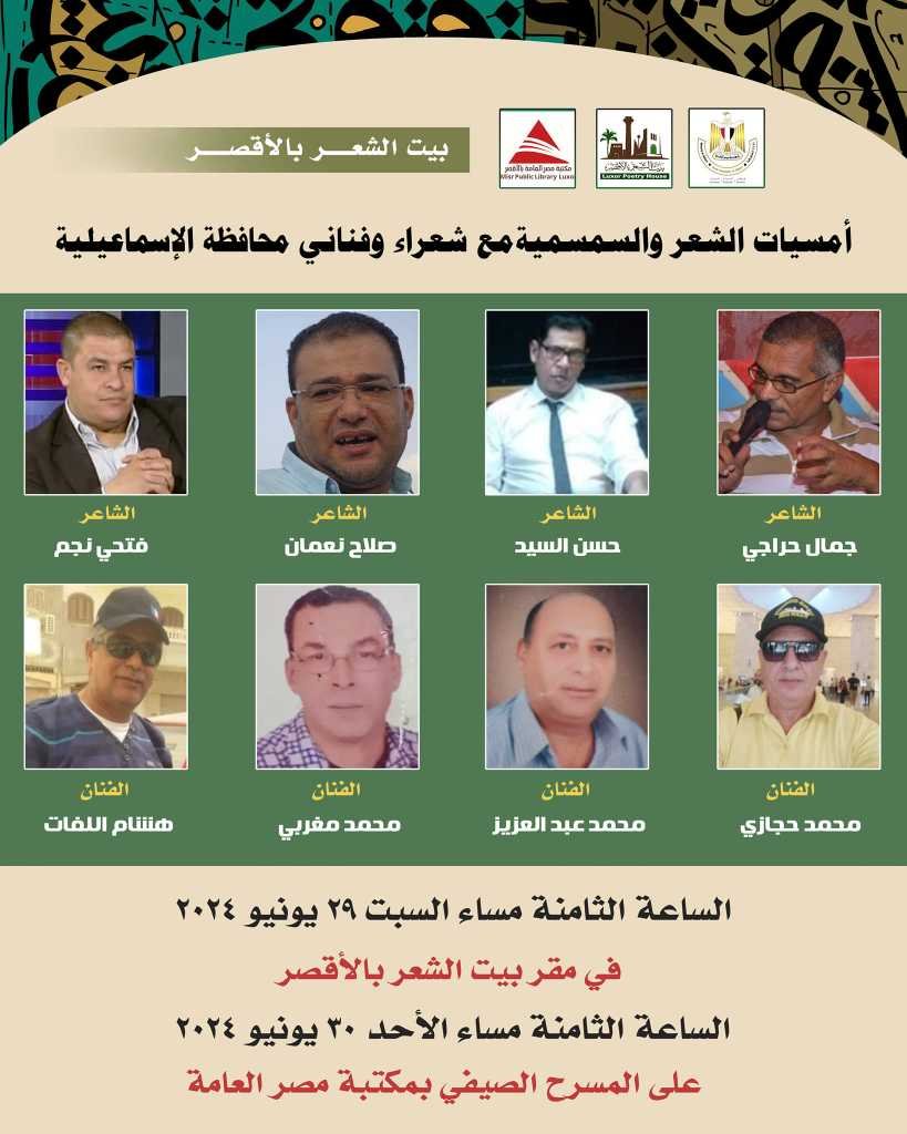 أصدقاء و صديقات بيت الشعر بالأقصر معكم و بكم نفتح أبواب الجمال و الإبداع، تجربة جديدة يقدمها بيت الشعر بالأقصر باستضافة أدباء وفناني واحدة من المحافظات المصرية ذات الخصوصية الوطنية والثقافية، ليقدموا نماذج شعرية وفنية تعبر عن الواقع الثقافي الذي يميزها، في أمسيتين فيهما من الشعر والفنون الشعبية مع ثمانية شعراء وفنانين من محافظة الإسماعيلية الحبيبة، الساعة الثامنة مساء يوم السبت الموافق ٢٩ من يونية ٢٠٢٤م